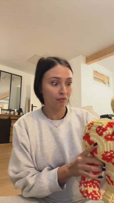 Une fois bien assemblé, le nounours est très solide grâce à la qualité des briques qui s’emboîtent parfaitement — idéal pour la déco.
